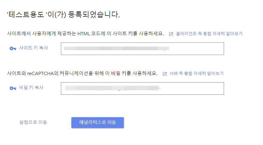 저장하면 비밀키와 사이트 키를 준다. 잘 저장해두자!