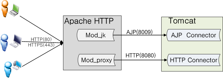 크게 mod_jk 와 mod_proxy 두 개의 연계 방식이 있다.두 가지 방식 모두 장단점이 있으며 환경이나 필요 여부에 따라 골라서 선택하면 된다.