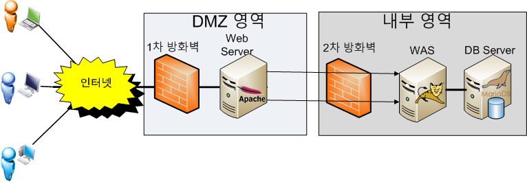 아파치 웹 서버를 DMZ 영역에 두고 서비스하면 위와 같은 우려가 없어진다. 웹 서버는 오로지 톰캣에만 연결할 수 있으므로 웹 서버가 해킹당해도 DB 서버까지 침입하기가 힘들다.