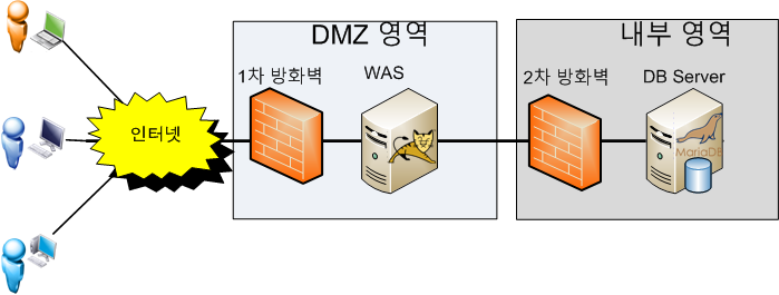 이런 구성에서는 WAS 가 해킹당하면 WAS 에 있는 DB 서버 설정을 보면 DB 서버의 연결 정보를 알수 있고 연결이 가능하므로 데이타까지 유출될수 있다.