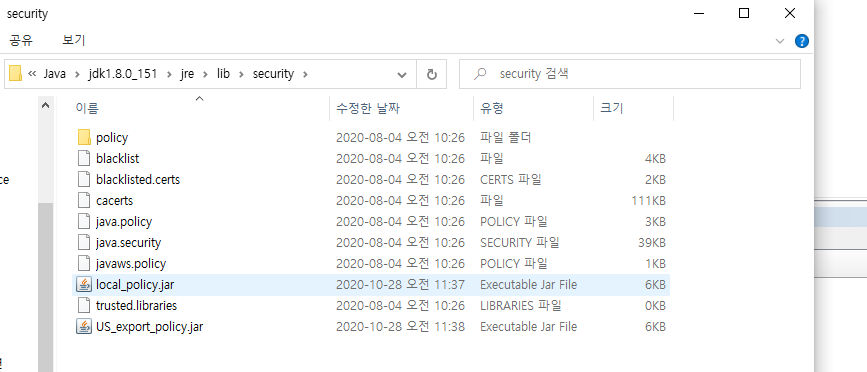 java 폴더로 이동 -> jdk -> jre -> lib -> security 에 들어가본다.