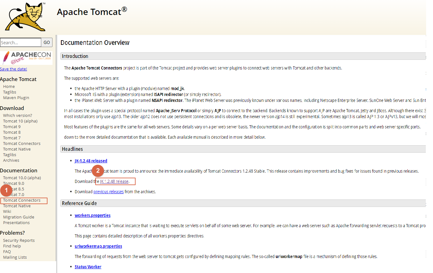 1. tomcat.apache.org/connectors-doc/ 에 접속해1, 2 순서대로 클릭해준다.